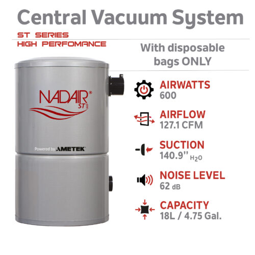 600 AIRWATTS Compact Central Vacuum System, 18L / 4.75 Gal. Canister, Must be used with a disposable bag and protective permanent filter at all times