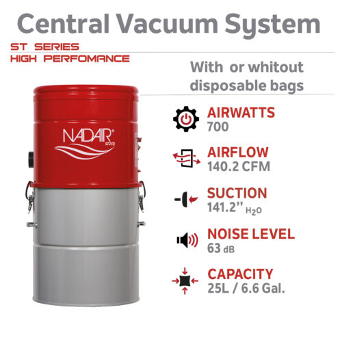 700 AIRWATTS Compact Hybrid Central Vacuum System, 25L / 6.6 Gal. Canister, Can be used with or wihthout disposable filtration bags