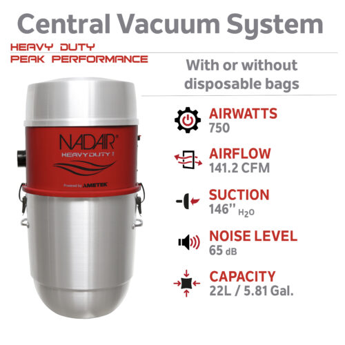 750 AIRWATTS Hybrid Central Vacuum System, 22L / 5.81 Gal., Can be used with or without disposable filtration bags