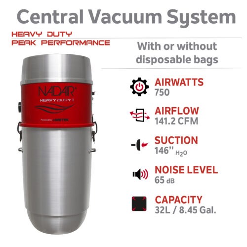 750 AIRWATTS Hybrid Central Vacuum System, 32L / 8.45 Gal., Can be used with or without disposable filtration bags