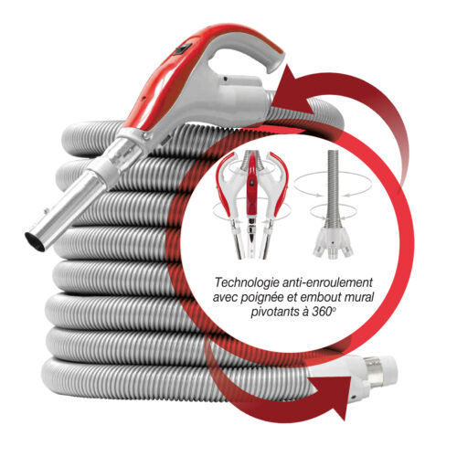 • Boyau bas-voltage avec interrupteur marche/arrêt, technologie anti-enroulement avec poignée et embout mural pivotants à 360˚ (disponible en 30 pi, 35 pi ou 40 pi)