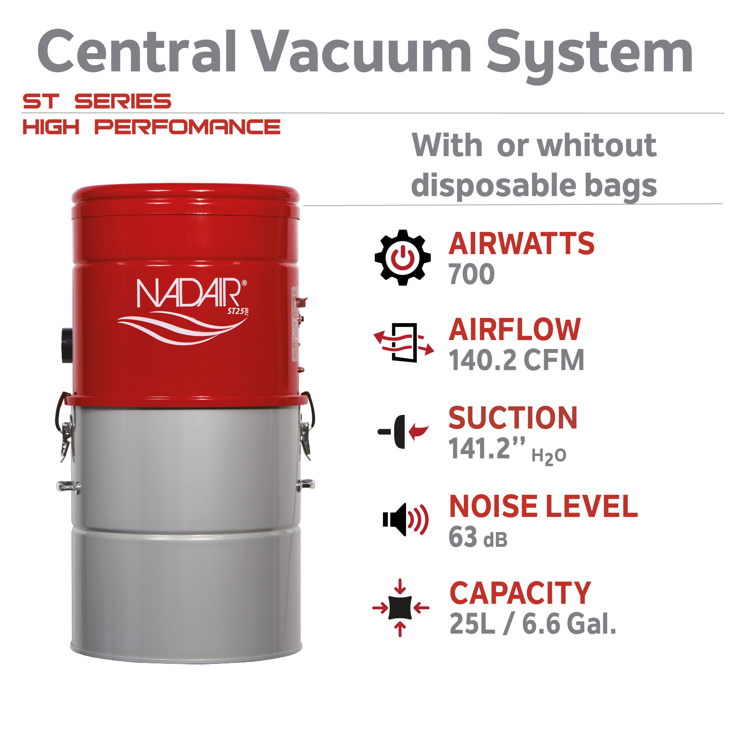 700 AIRWATTS Compact Hybrid Central Vacuum System, 25L / 6.6 Gal. Canister, Can be used with or wihthout disposable filtration bags